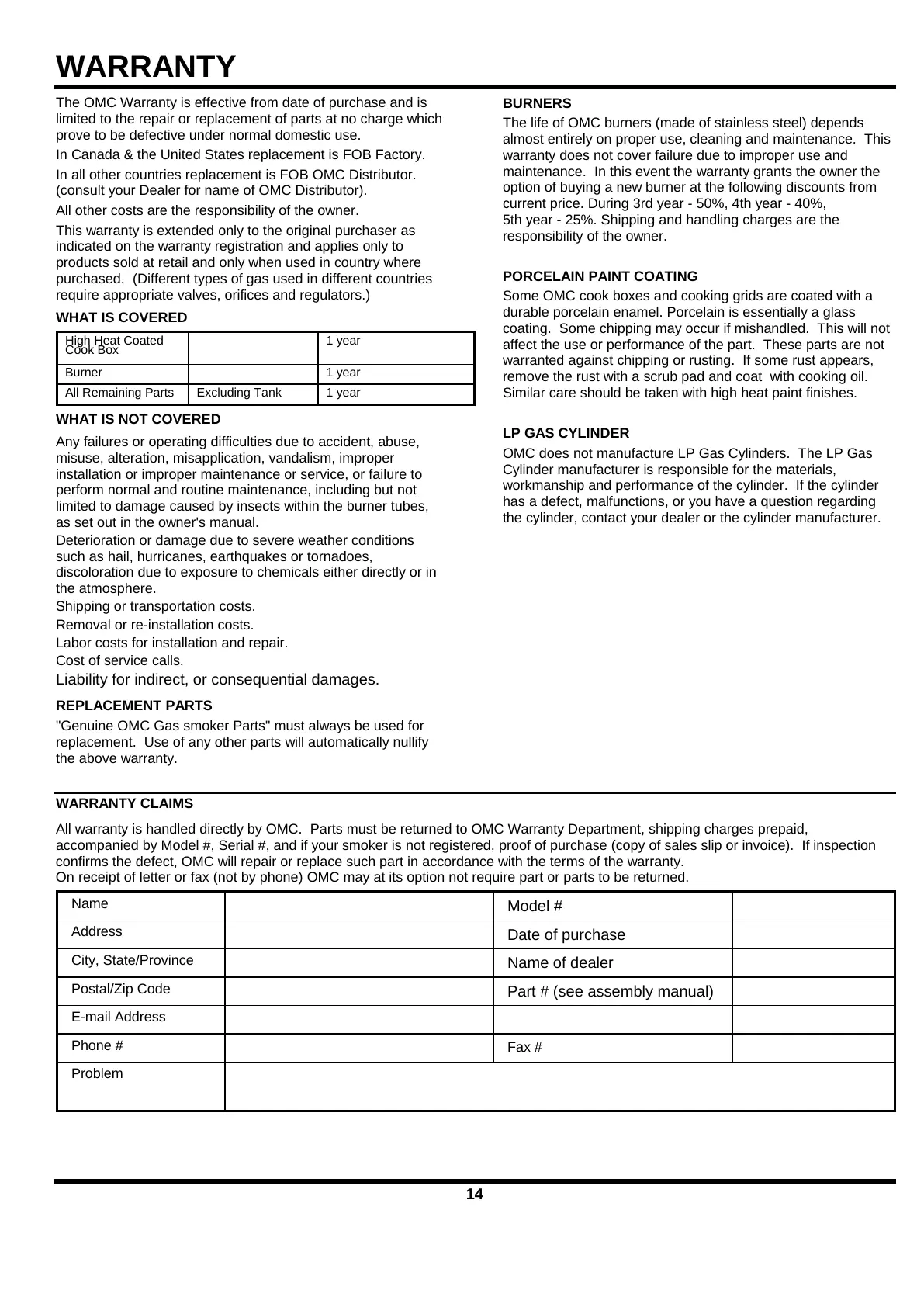 "Genuine OMC Gas smoker Parts" must always be used for