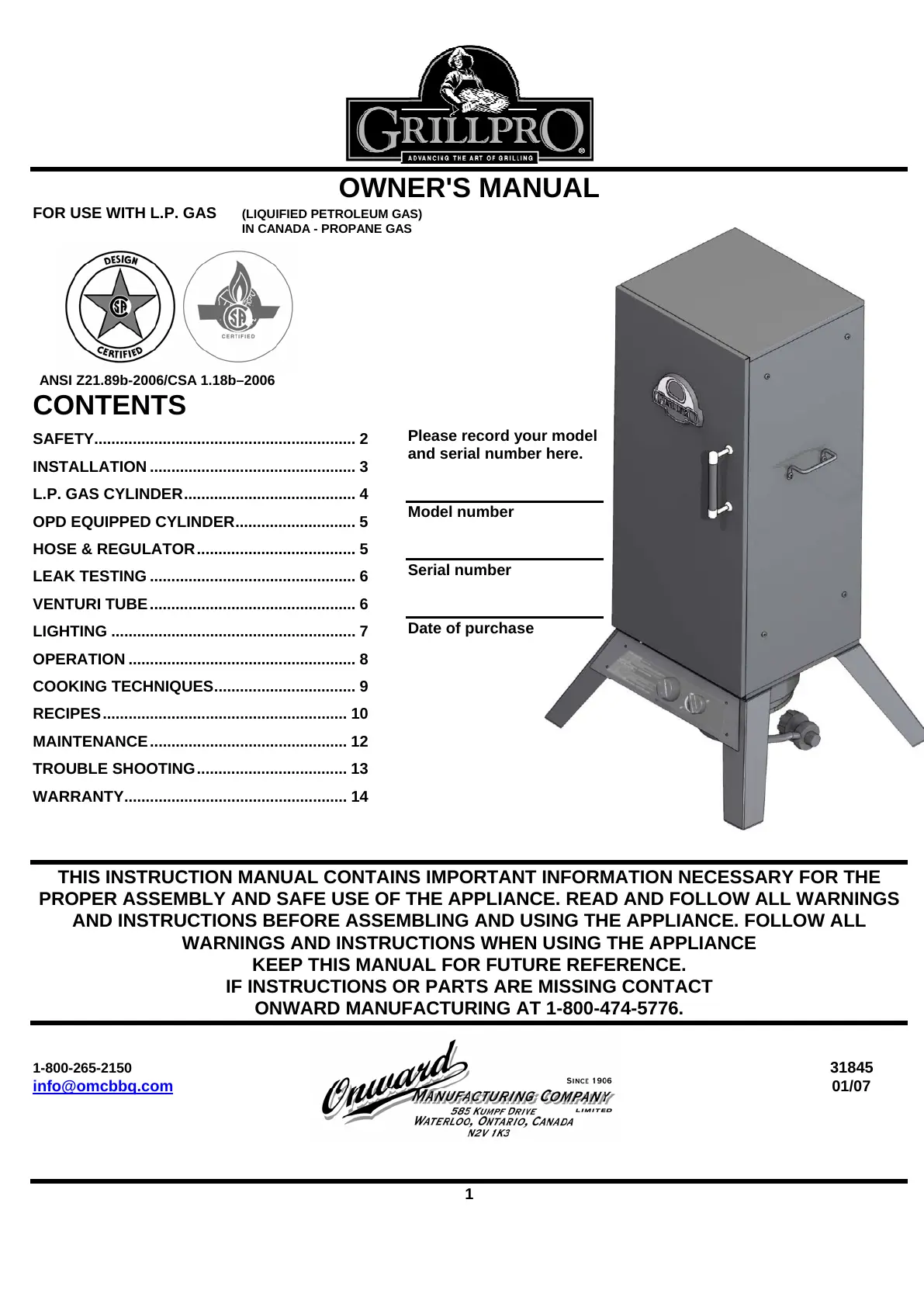 ONWARD MANUFACTURING AT 1-800-474-5776.