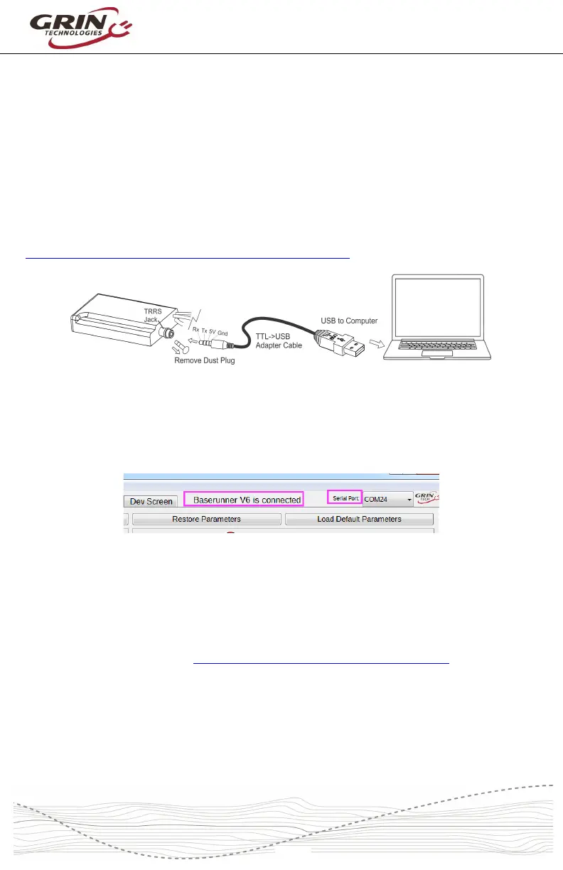 With the Baserunner V6 powered on, plug in the TTL->USB cable from your