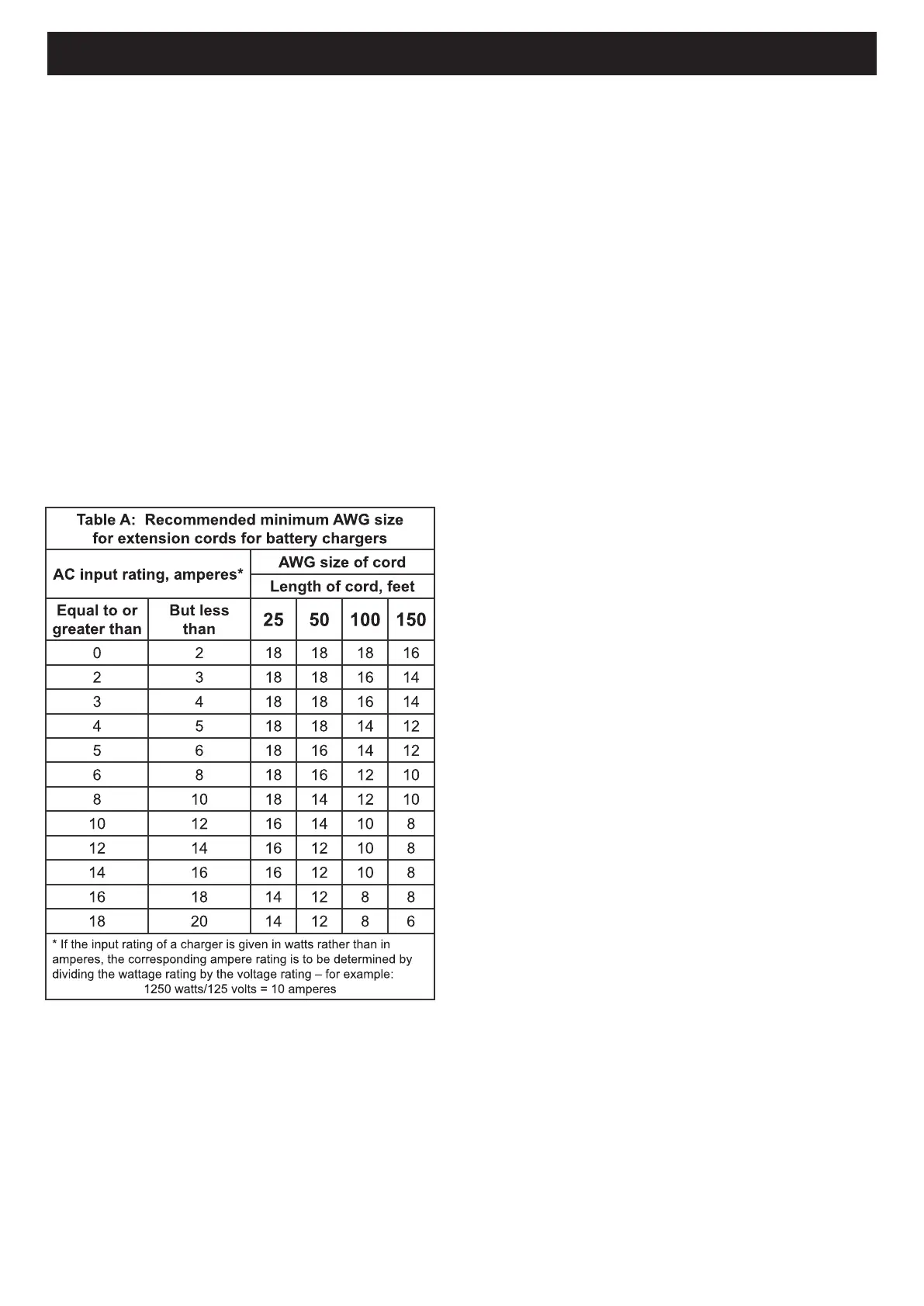rating of charger as specified in Table A.