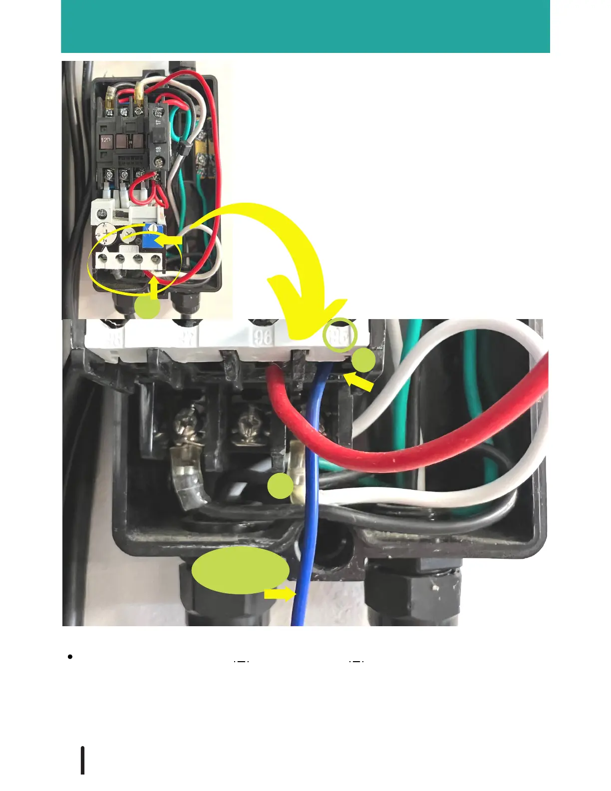 Land the BLUE Control wire (F) in the terminal 95 (9) (located above the white outgoing