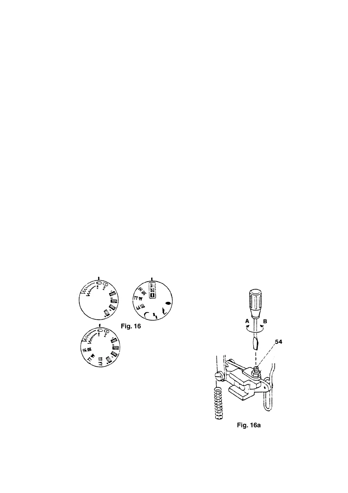 ● If the fabric is fed forwards, turn screw 54 slightly in direction “A” (fig. 16a).