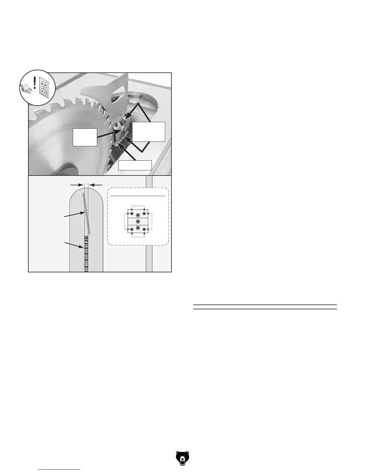 block holds the spreader/riving knife, adjust