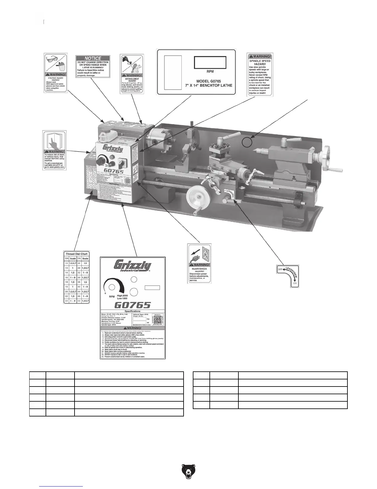 252 P0765252 THREAD DIAL CHART LABEL 258 P0765258 SPINDLE SPEED WARNING LABEL