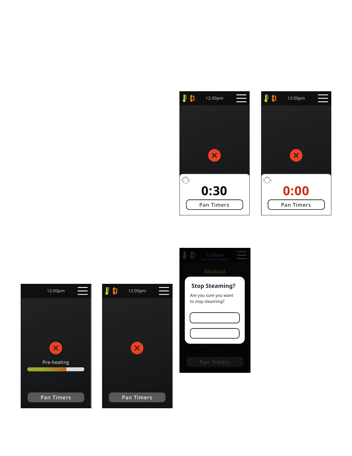If red “X” is pressed, screen will transition to Pre-heating screen.