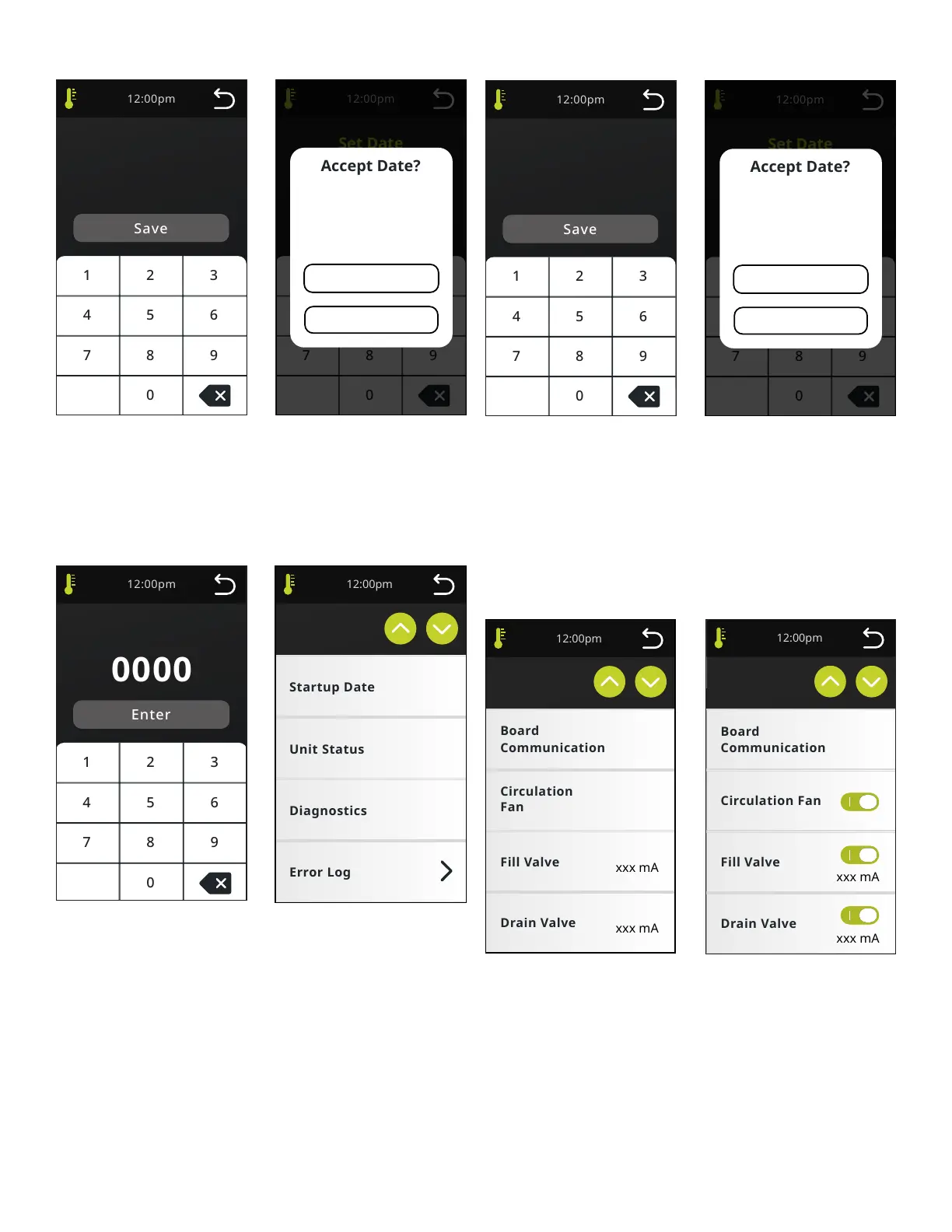 font)), Circulation Fan (ON/OFF), Fill Valve (ON/OFF xxx mA), Drain Valve (On/ Off