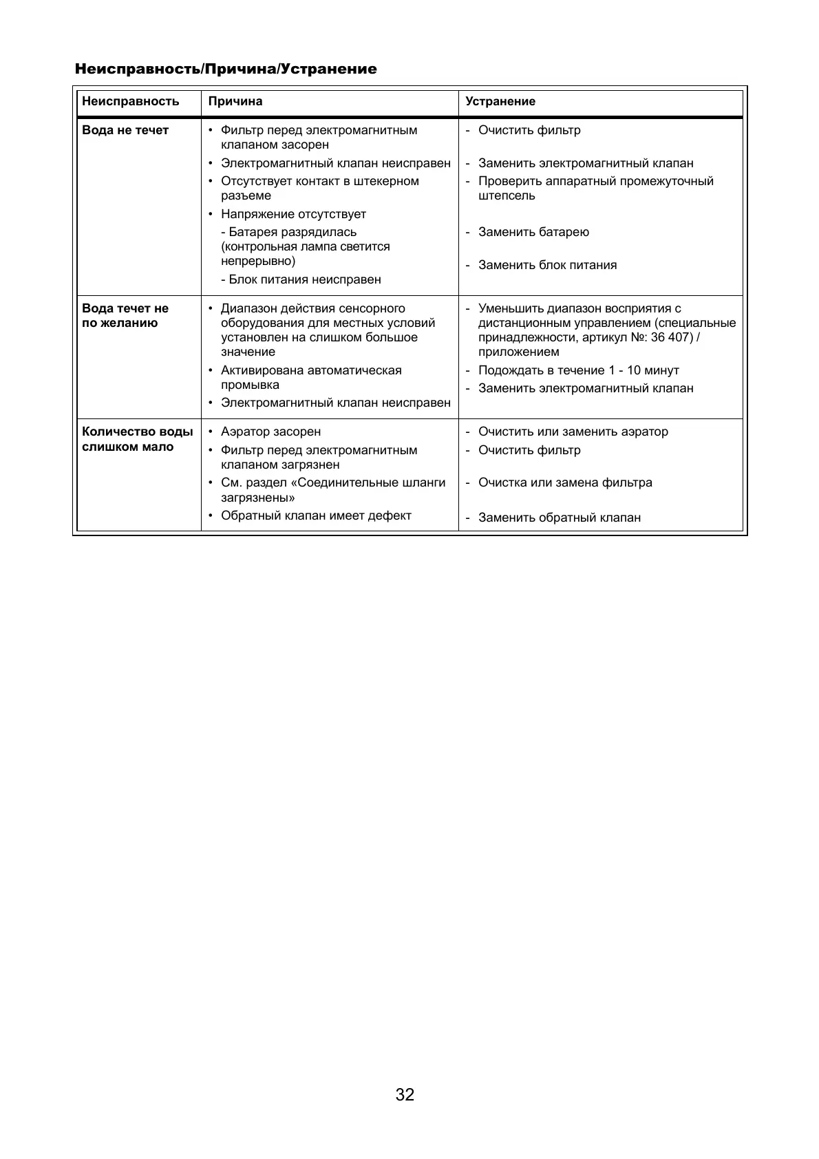 Неисправность/Причина/Устранение