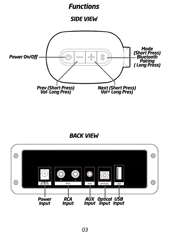 Groov-e SOUNDBAR 75 - Soundbar Functions Overview; Side View Controls; Back Panel Ports