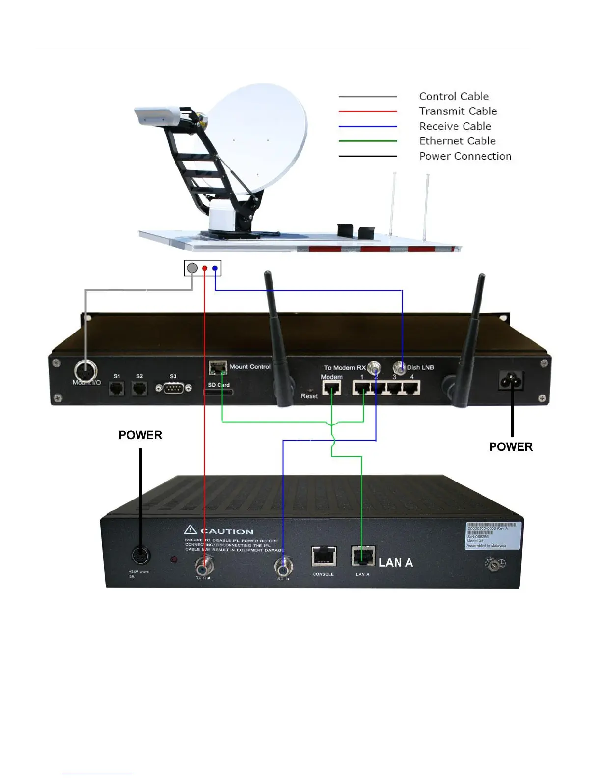 Above is the standard wiring between the Toughsat, the TS2 controller, and the iDirect X5 satellite router.