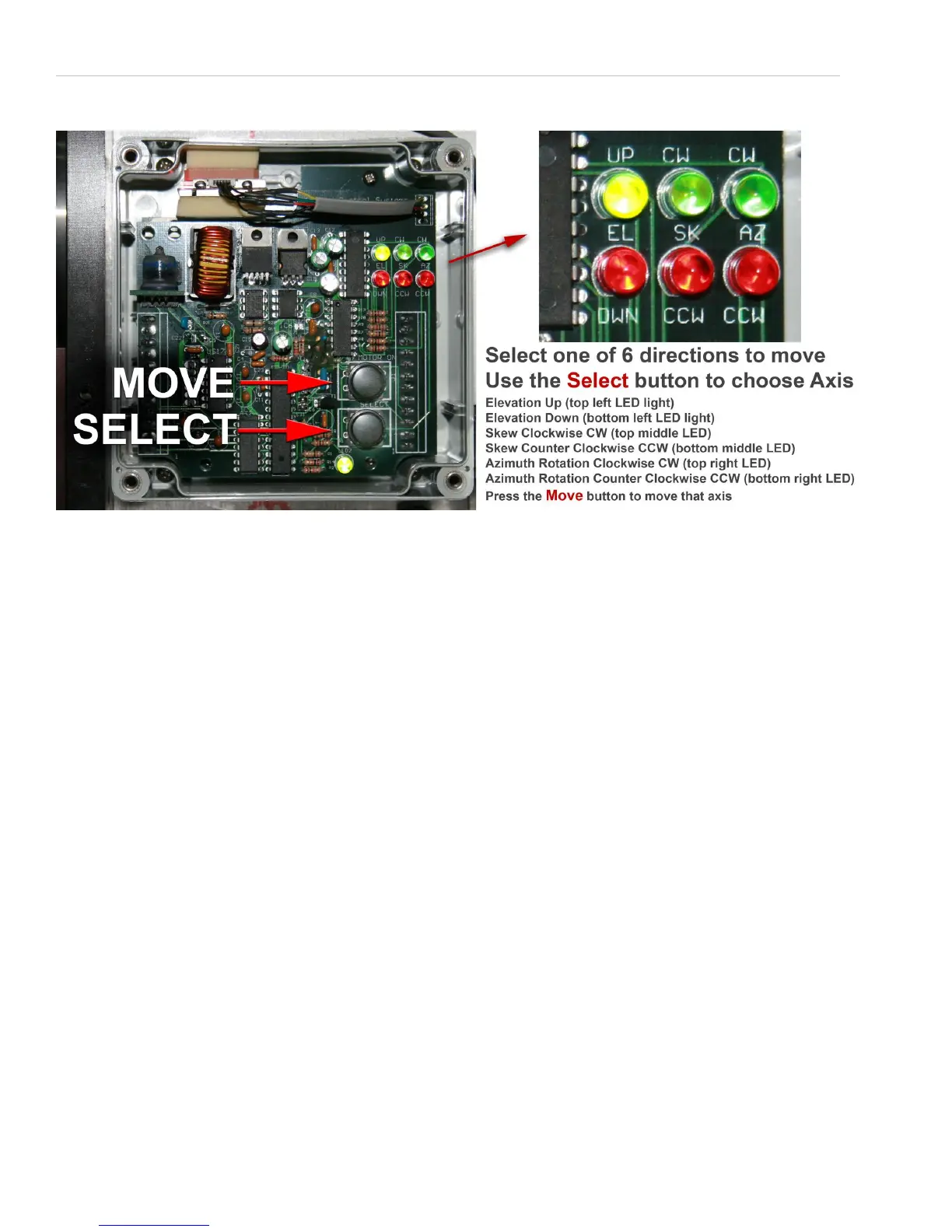 to the AZ - CW or AZ - CCW LED light. Next, press and HOLD the MOVE button until the antenna rotates into a desired