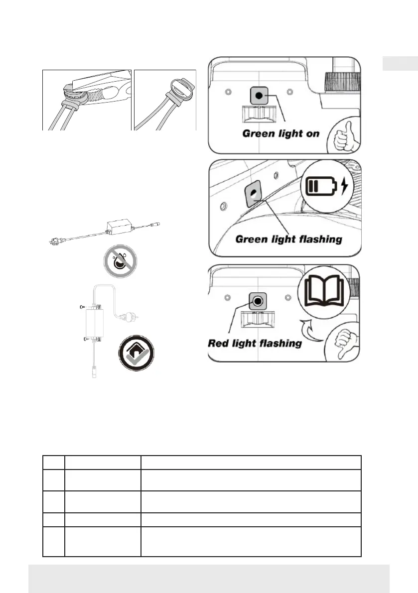 4 Rødt lys blinker Agrænsningskabel er ikke monteret korrekt i det røde/sorte stik