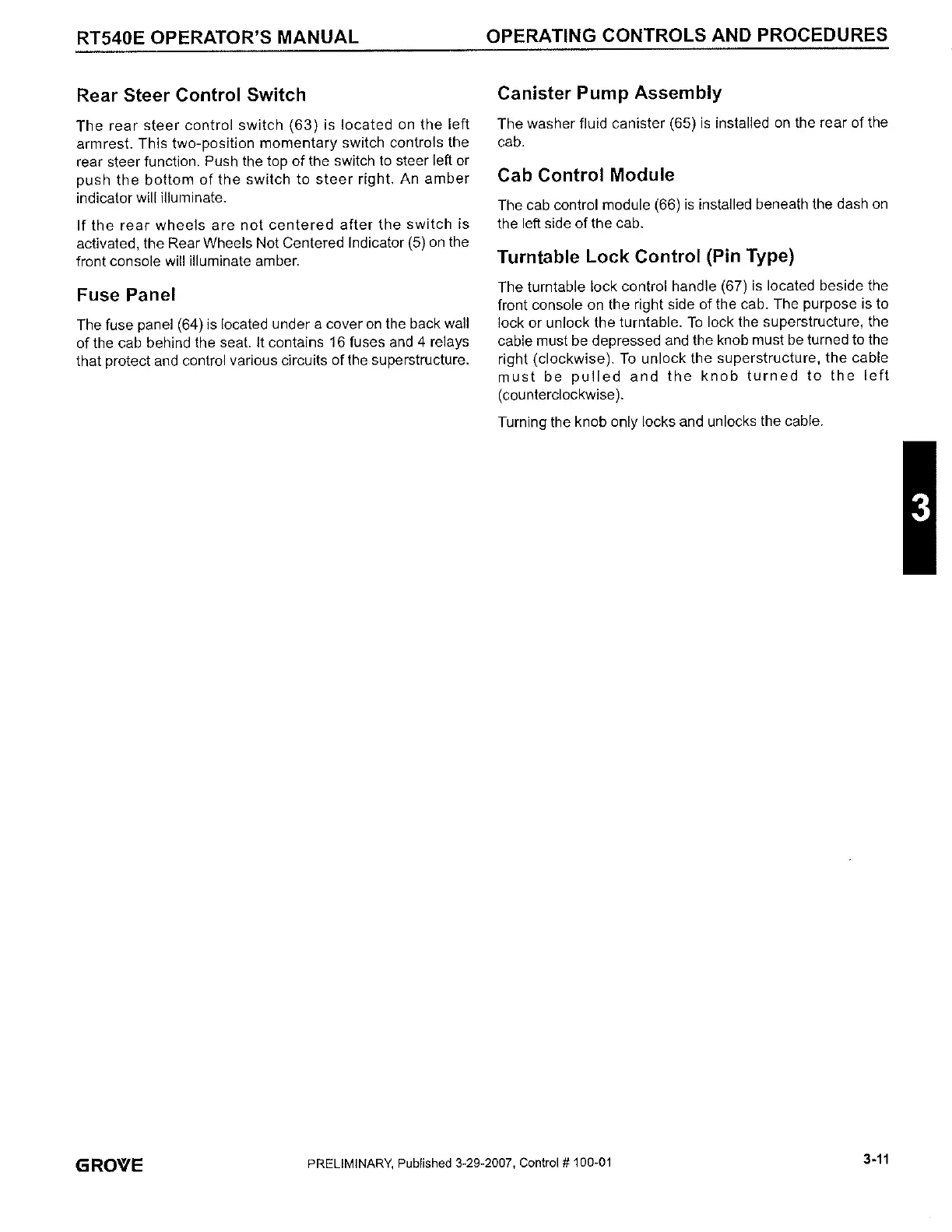 Grove RT540E - Rear Steer Control Switch; Fuse Panel; Canister Pump Assembly;Cab Control Module; Turntable Lock Control (Pin Type)