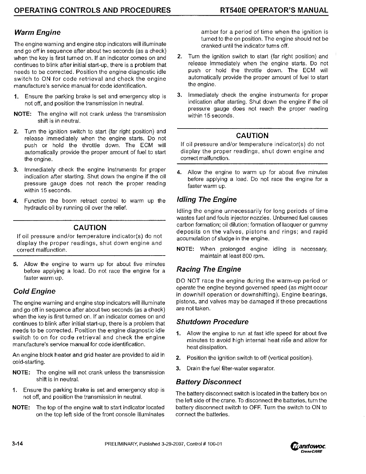Grove RT540E - Warm Engine; Cold Engine; Idling the Engine; Shutdown Procedure