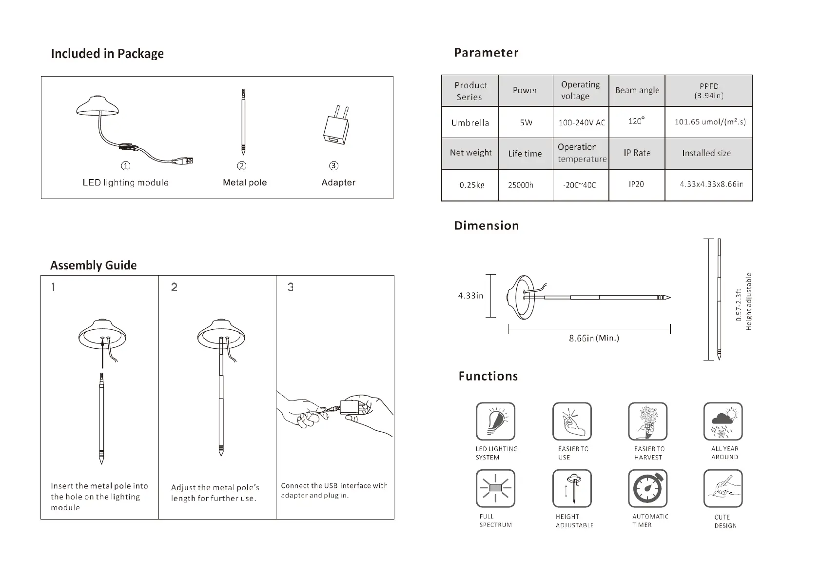 GrowLED UMBRELLA - Product Specifications and Parameters; Included in Package; Parameter Details; Dimension and Height Adjustability