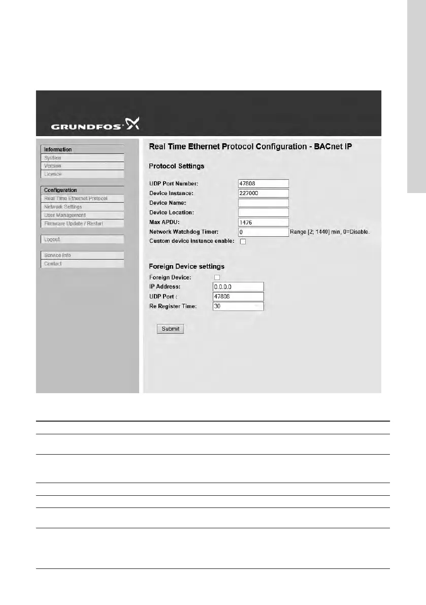 This web page is used to configure some of the parameters relevant to the BACnet IP protocol standard.