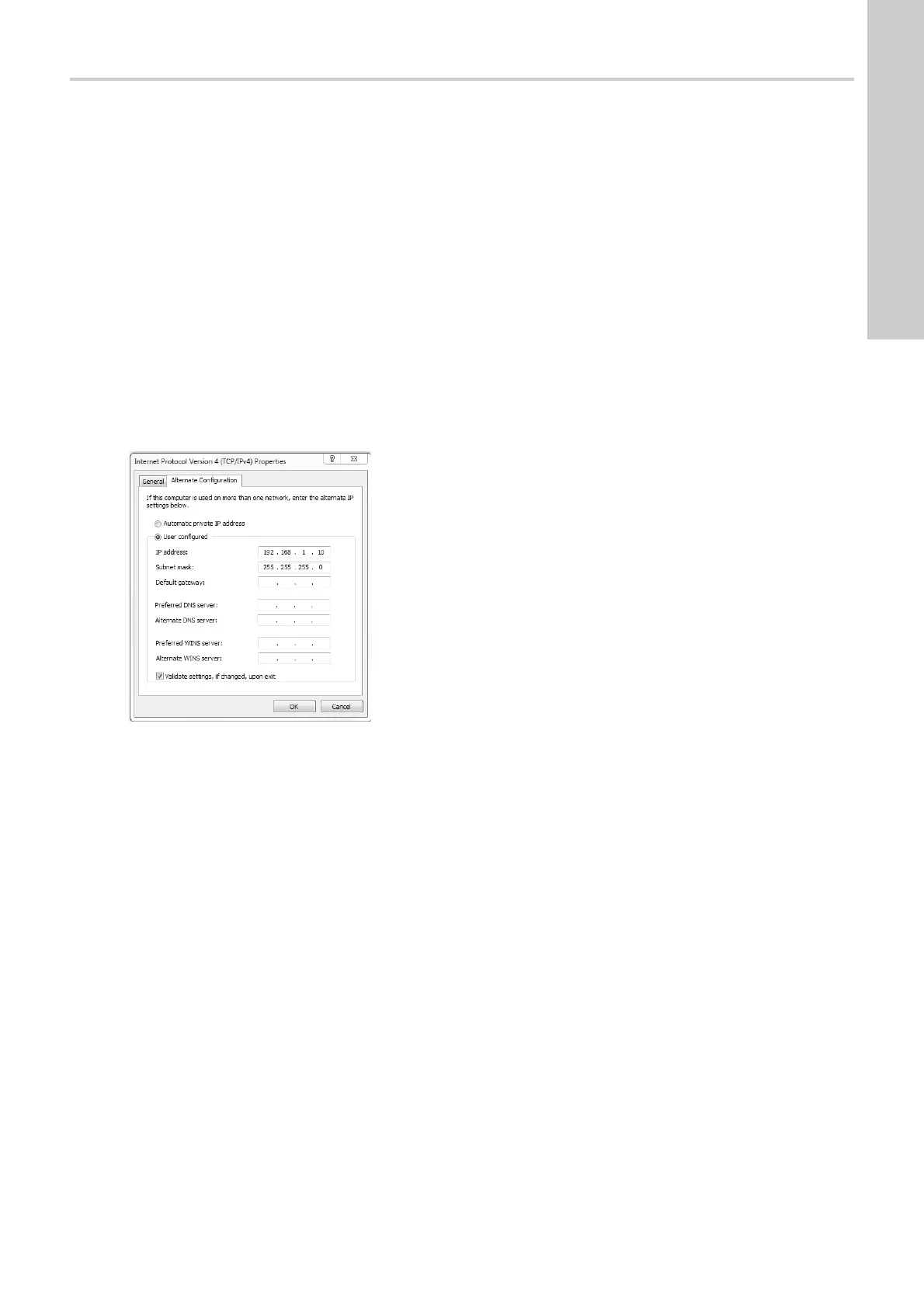 6. Select the "Alternate Configuration" tab and enter the user-configured IP address and the subnet mask you would like to assign to