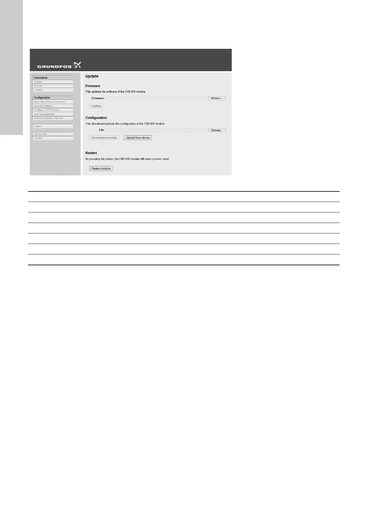 You can update the firmware by means of the built-in webserver. The binary file is supplied by Grundfos.