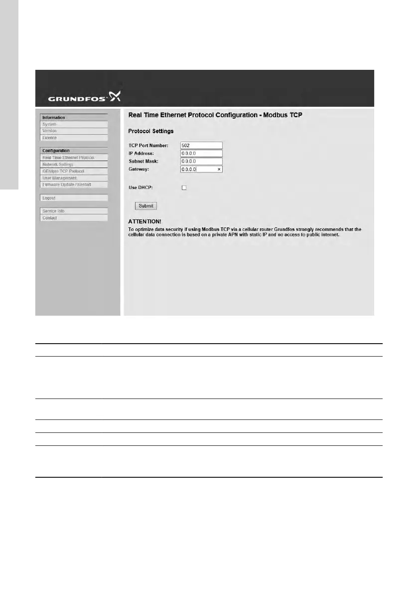 Configuration of the static IP address if a DHCP server is not used. Modbus TCP is not