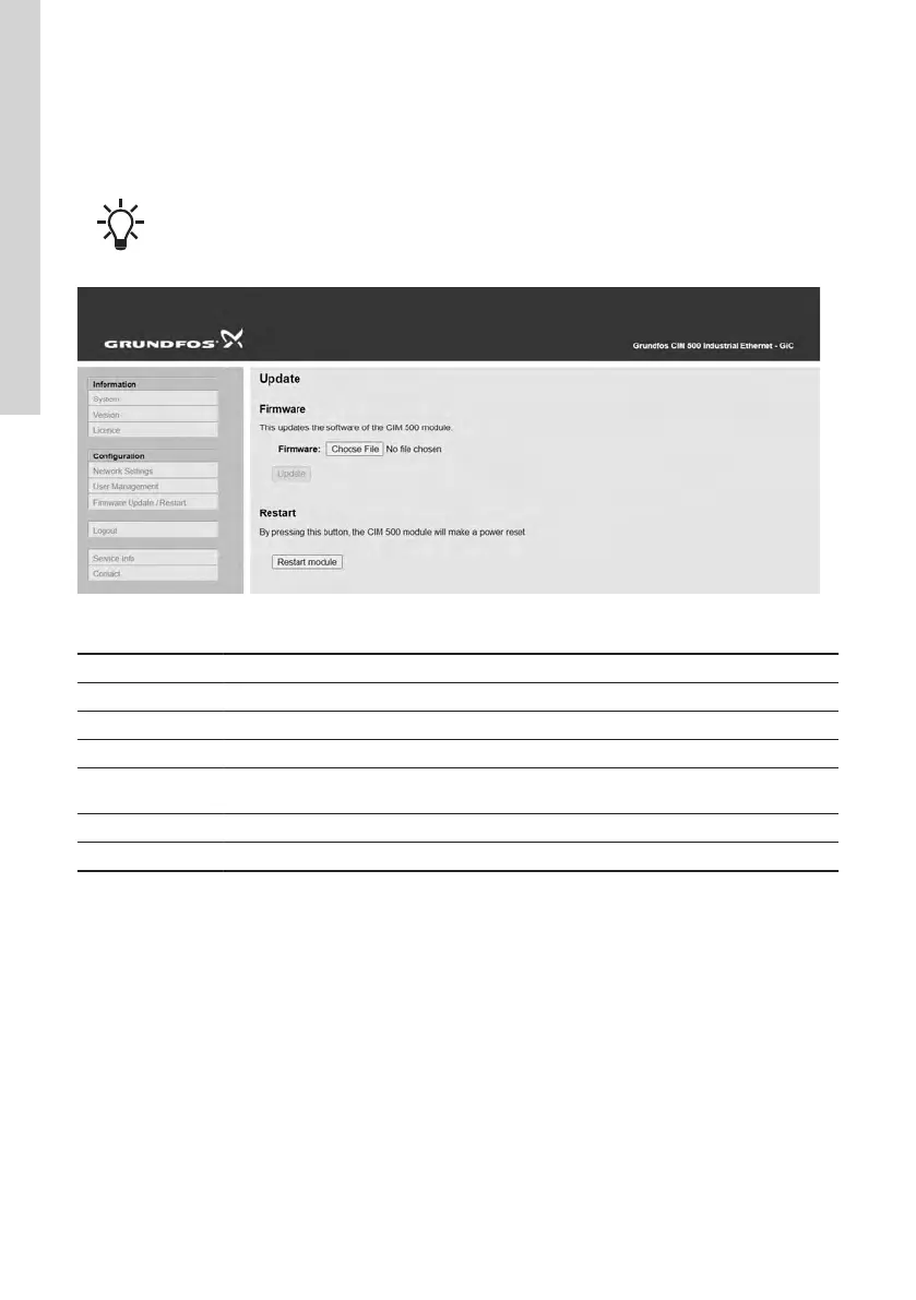ou can update the firmware by means of the built-in webserver. The binary file is supplied by Grundfos.