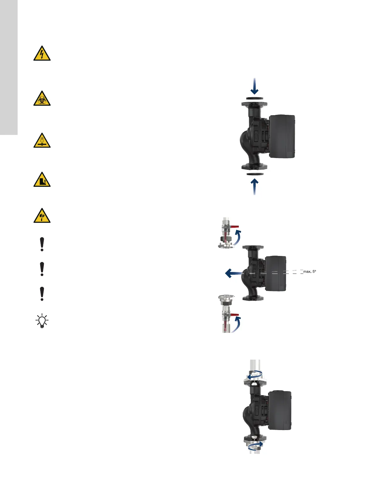 2. Install the pump with a horizontal motor shaft within ± 5°.
