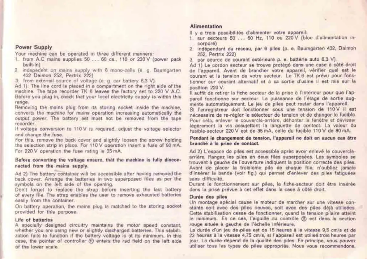 jeu de .piles est de 15 heures a Ia vitesse 9,5 cm/s