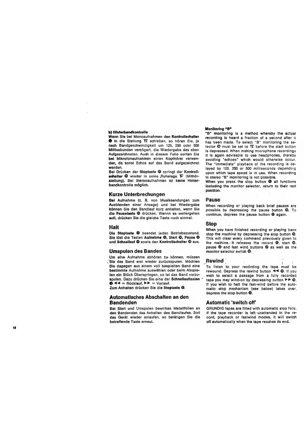 Grundig TK 747 - Playback and Recording Control; Monitoring via Tape; Pause Function; Stop Function