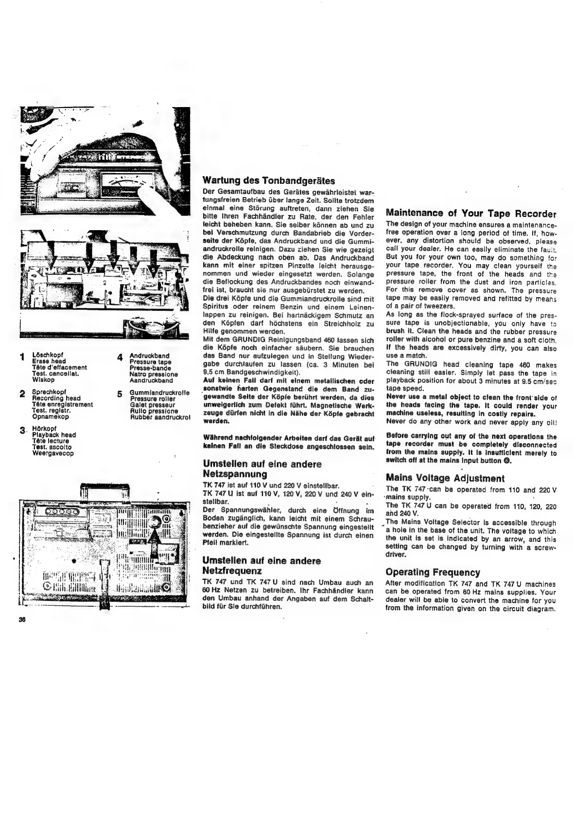 Grundig TK 747 - Tape Recorder Maintenance; General Maintenance; Mains Voltage Adjustment; Operating Frequency Adjustment