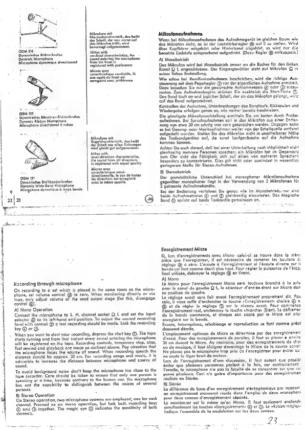 Grundig TK46 - Microphone Recording; Mono Microphone Operation; Stereo Microphone Operation