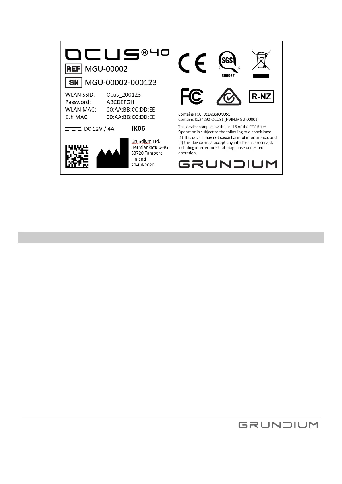 Image 4. Label example with a serial number, SSID and a password.