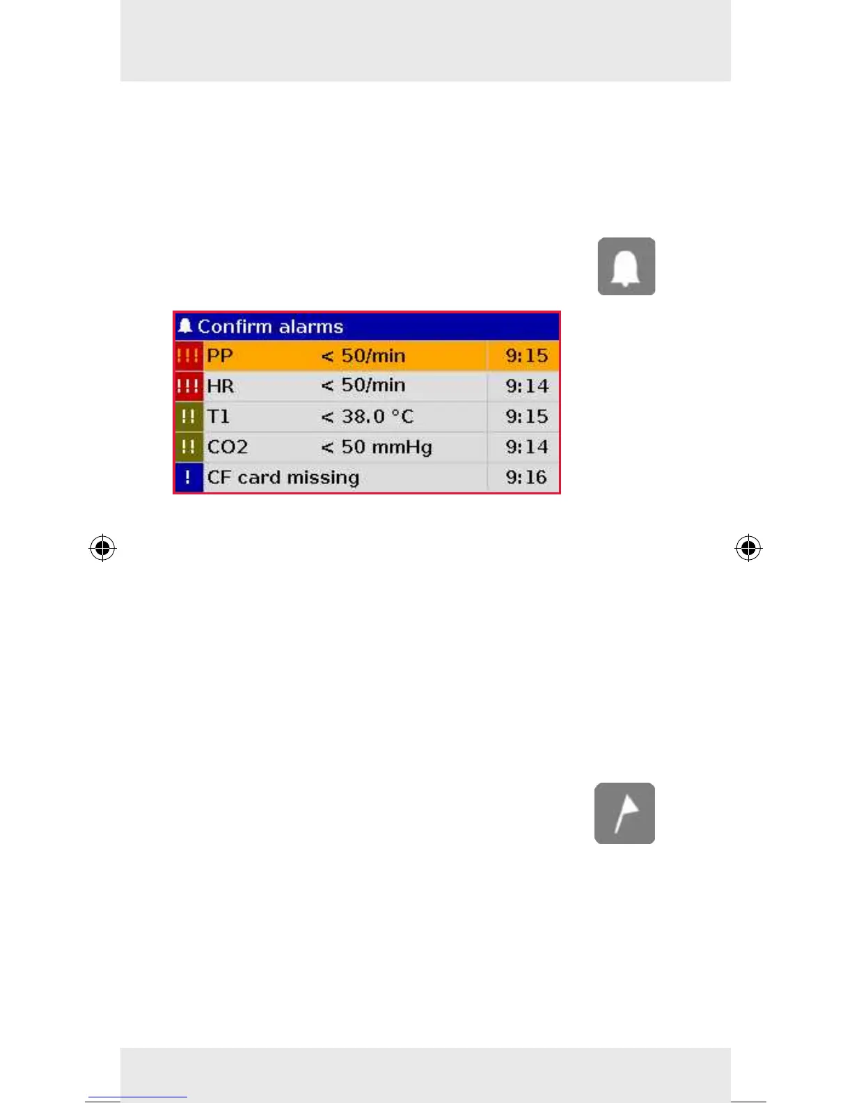 Alarms can have high (!!!), medium (!!) and low (!) priority.