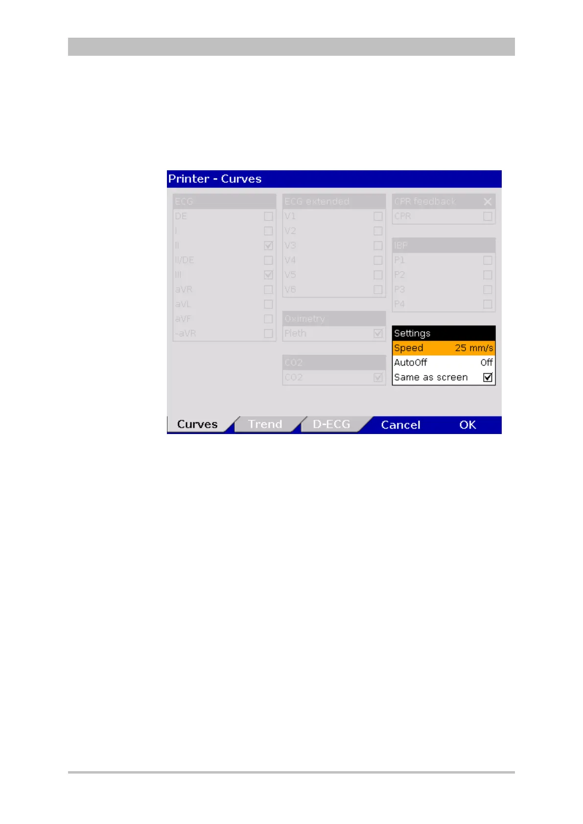 3. Deactivate the checkbox “Same as screen” to enable selection of ECG