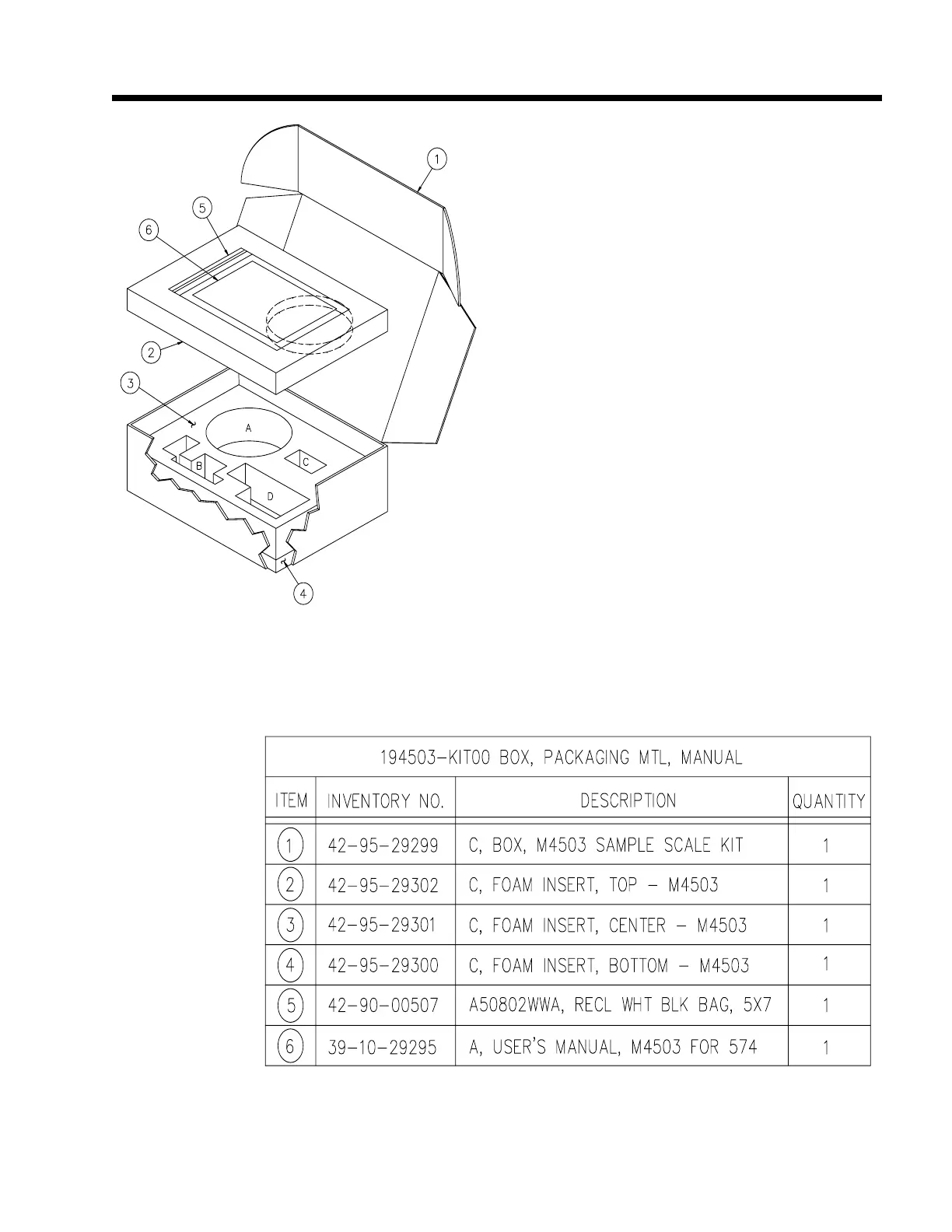 GSE 574 - Figure 39 Sample Scale Kit Packaging; Table 43 Two Pound Sample Scale Kit Packaging Material (Parts Listing)