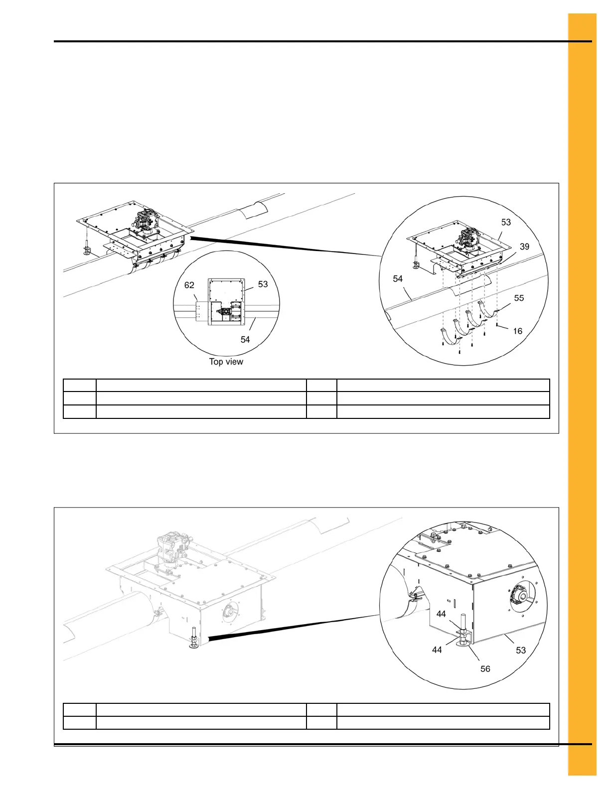 2. Attach the center well (53) to the unload tube (54) using four half bands (55), eight 5/16" x 1-1/4"