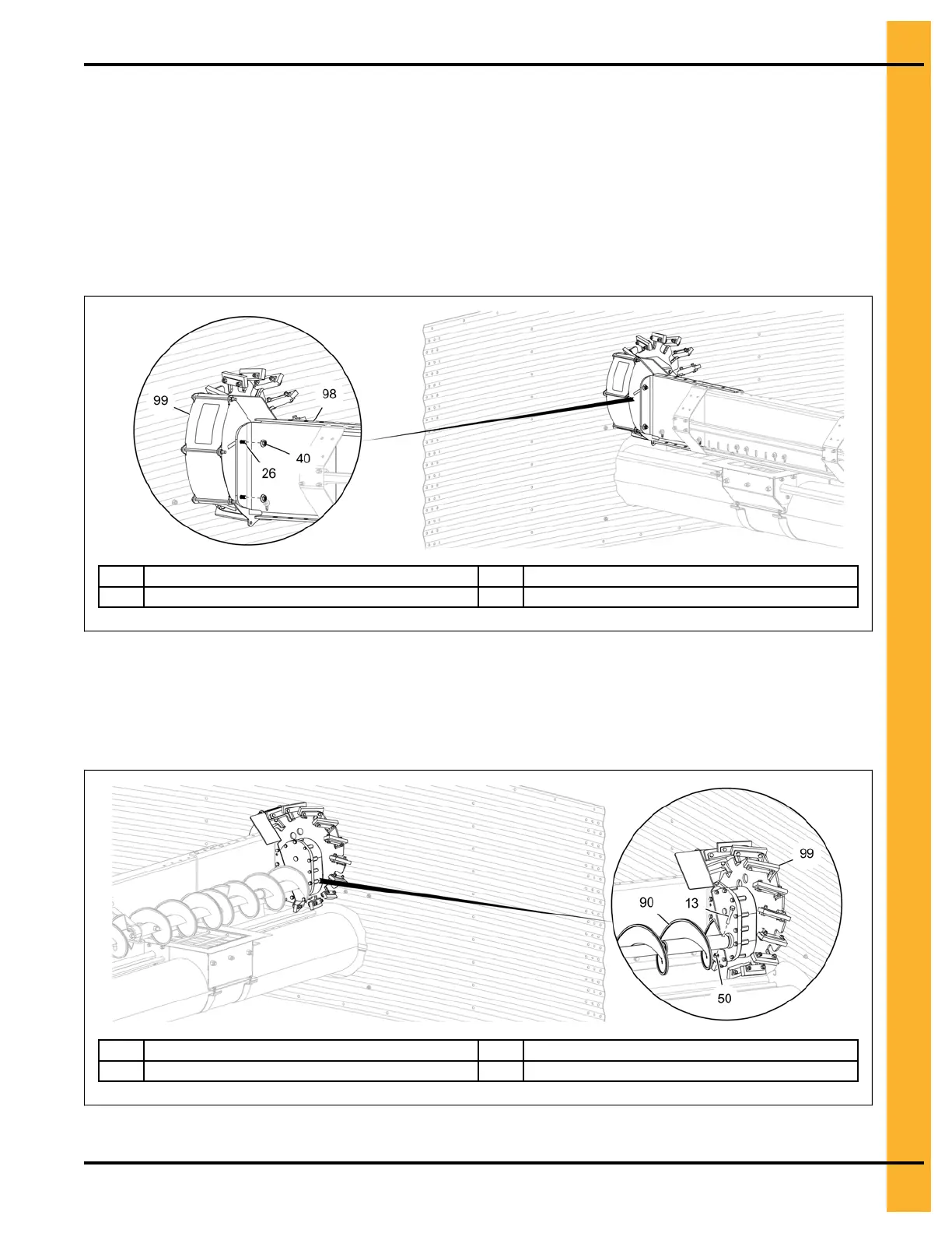 2. Secure the sweep wheel assembly (99) shaft to the last flight section (90) using a 3/8" x 3-1/2"