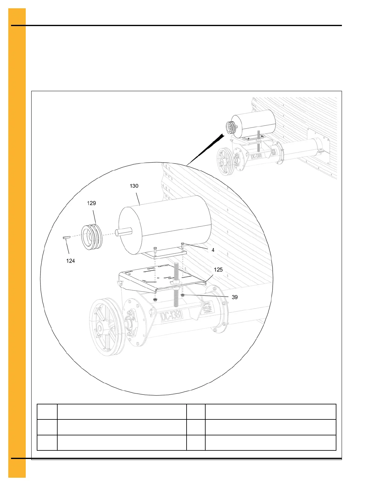 9. Install the motor sheave (129) to the motor (130) shaft using key (124).