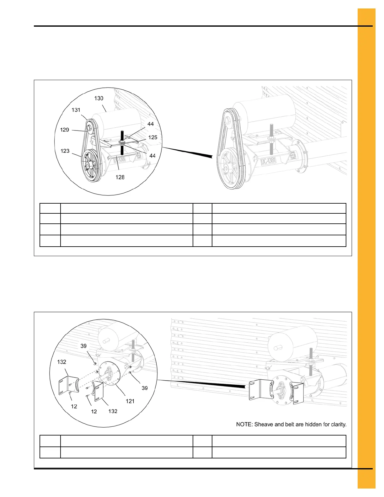 12.Install the belt guard brackets (132) to the bearing plate assembly (121) using 5/16" x 1" HHCS bolt