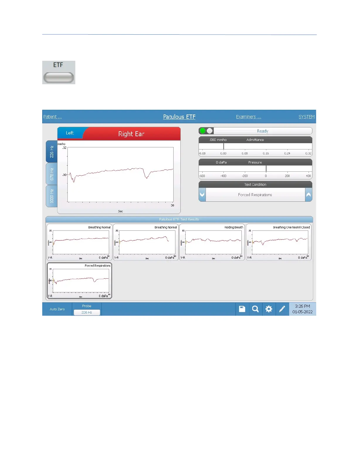 The ETF key displays the Patulous Eustachian Tube Test screen and loads the