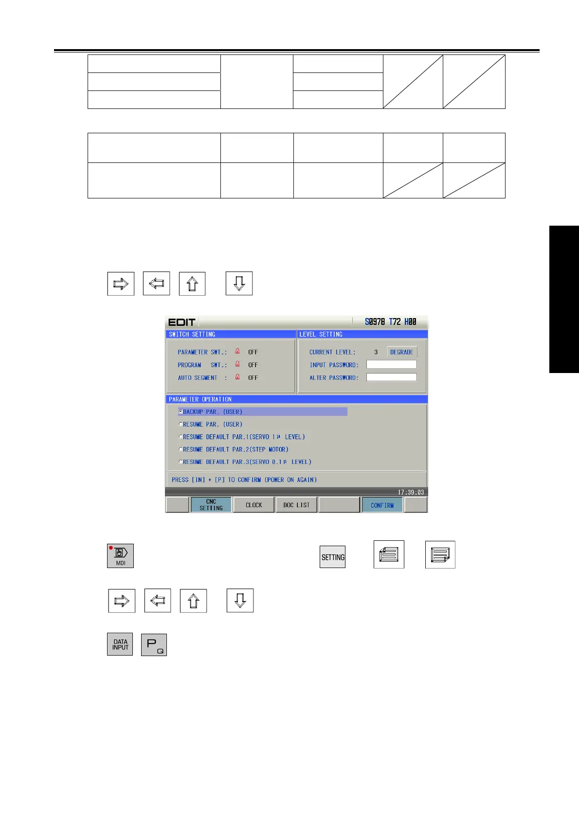 Example: to resume the CNC parameters to backup parameters, the steps are as follows: