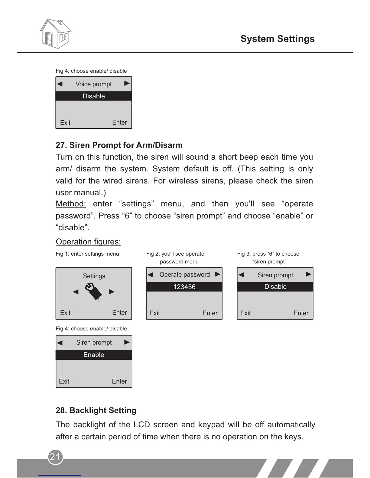 password”. Press “6” to choose “siren prompt” and choose “enable” or