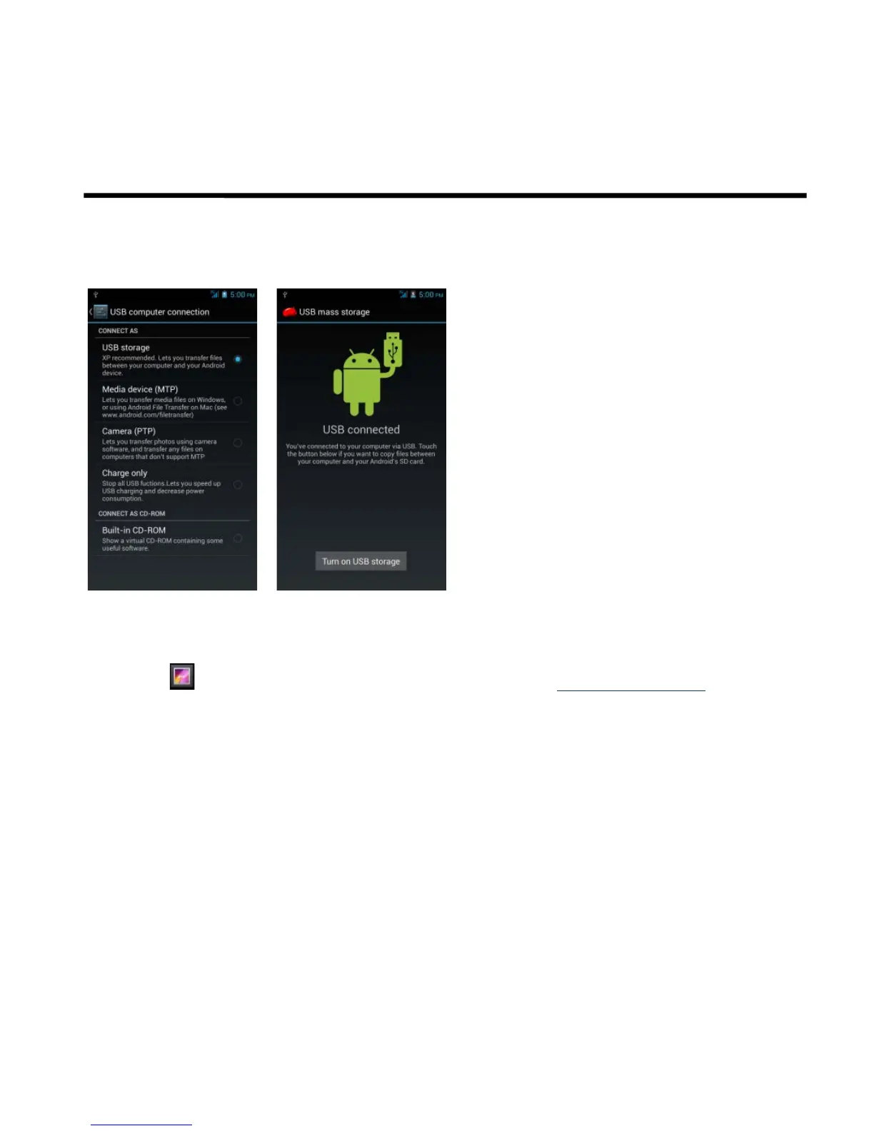 Tap and drag down Status Bar and tap Connected as USB Storageon your device. Please choose one of