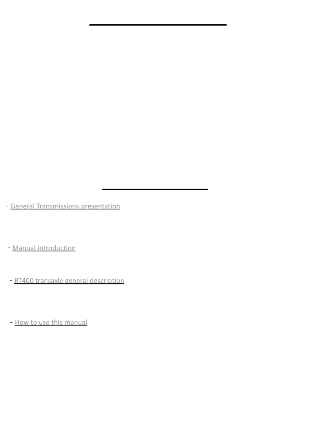 The purpose of this manual is to provide service and repair information for the RT400 transaxle.