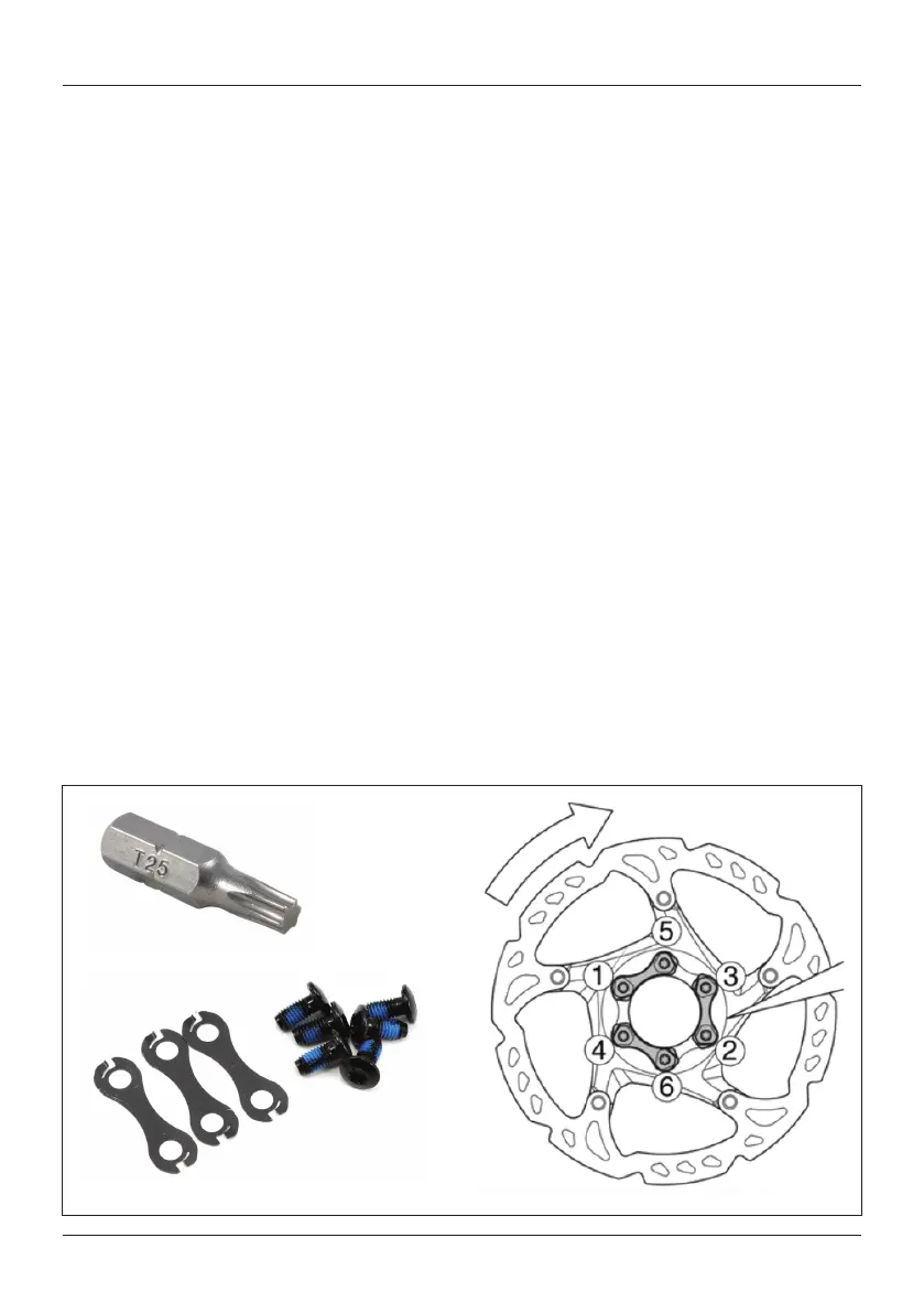 shaped locking washers, positioned with the sharp tabs up. Place bolts through the holes in the disc