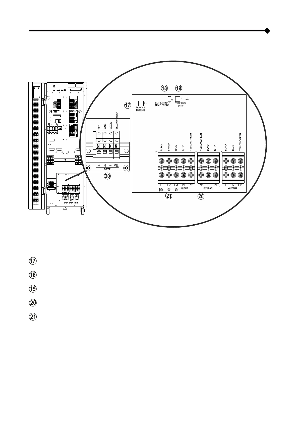 Conexiones de potencia: BATERÍA, ENTRADA, BYPASS SEPARADO, SALIDA