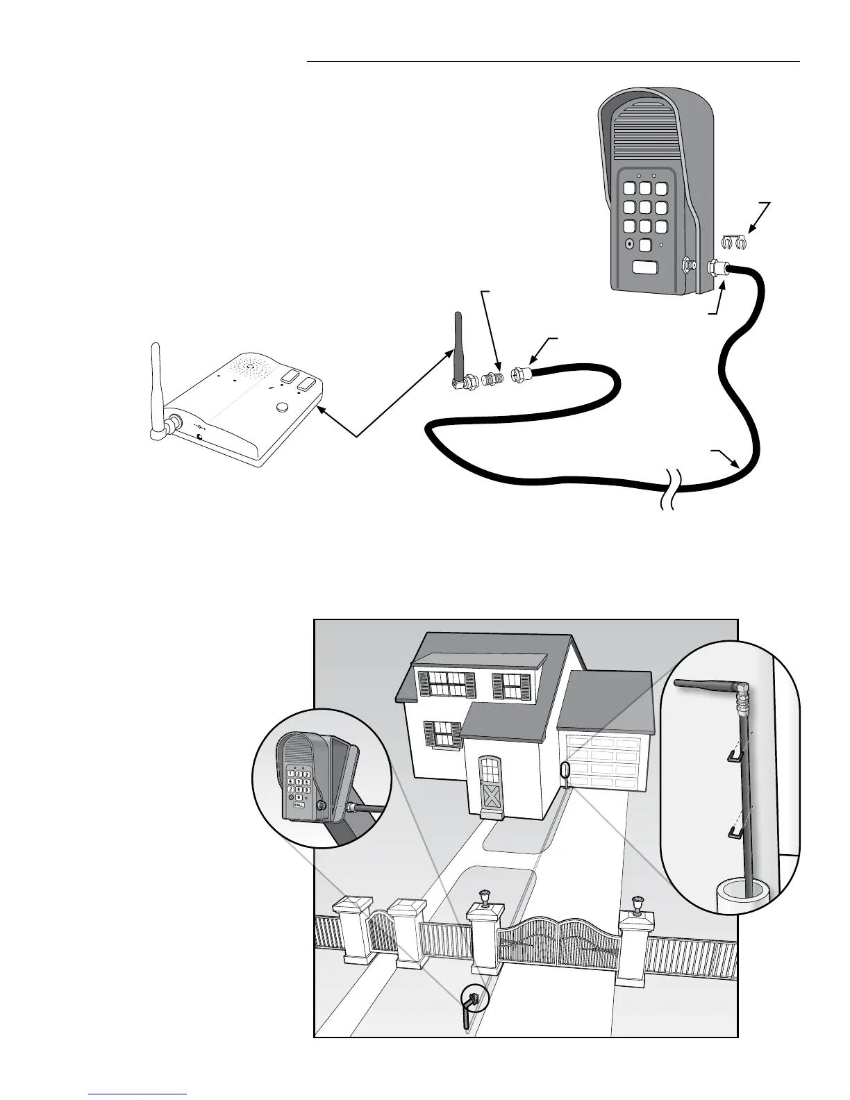 Run the co-ax cable in PVC conduit from the keypad at the gate to a convenient location at the house. A typical location