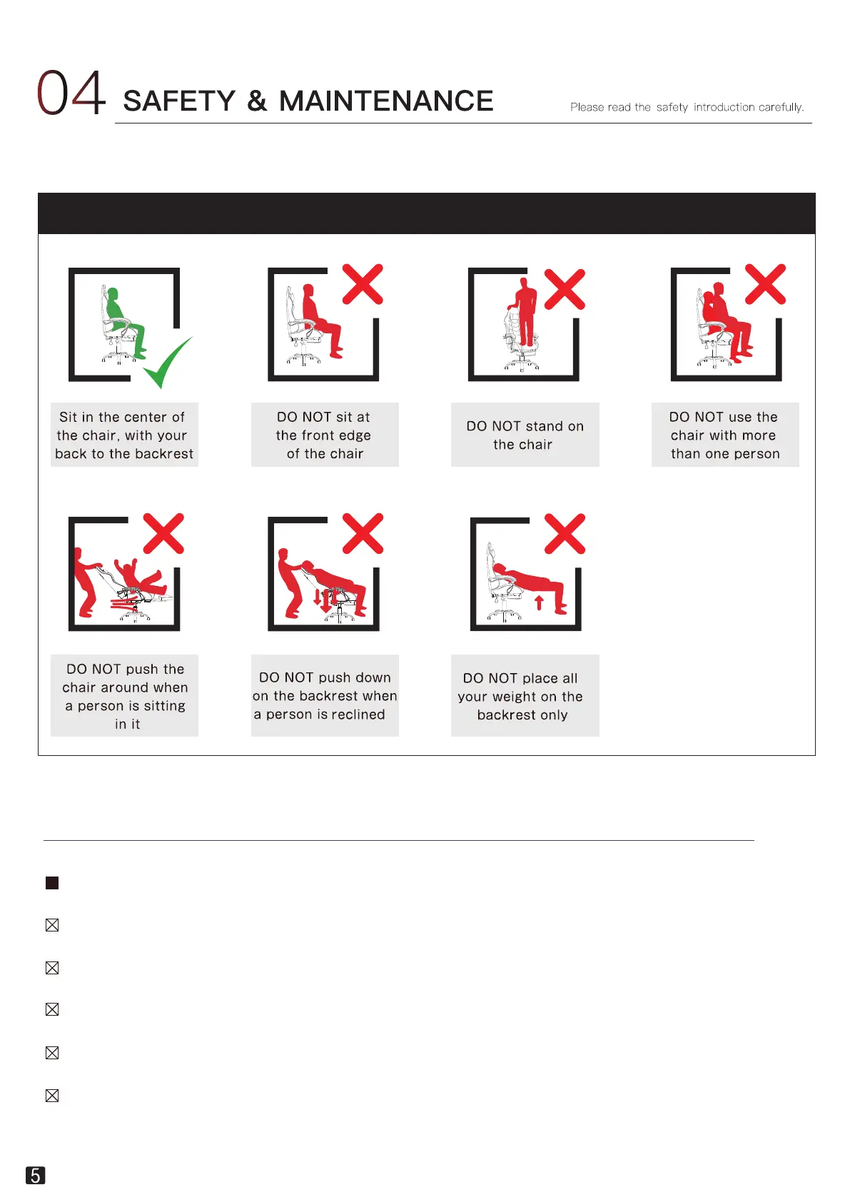 DO NOT stand on the chair, DO NOT use the chair as stepladder.