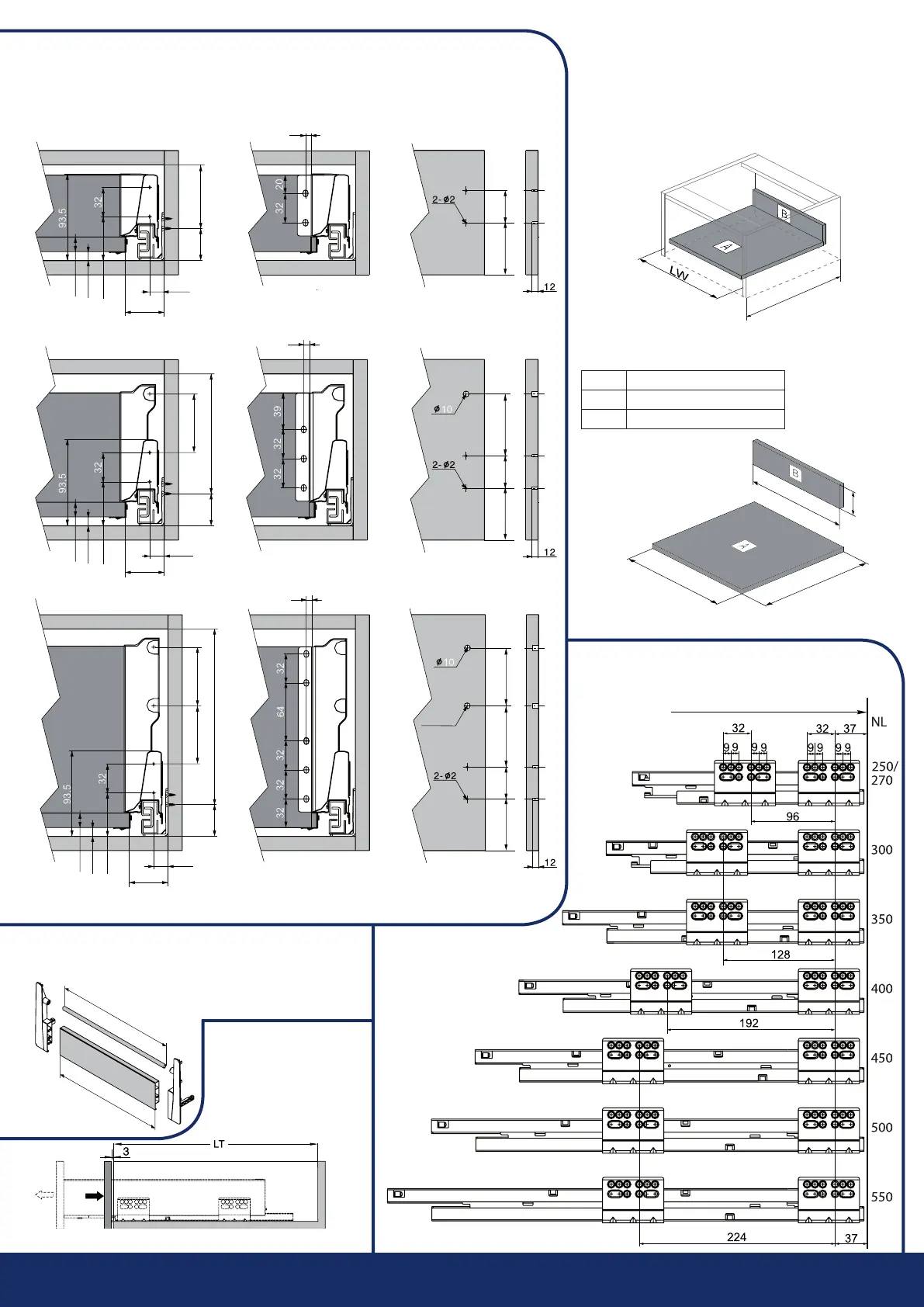 Mounting dimensions of drawer and body/
