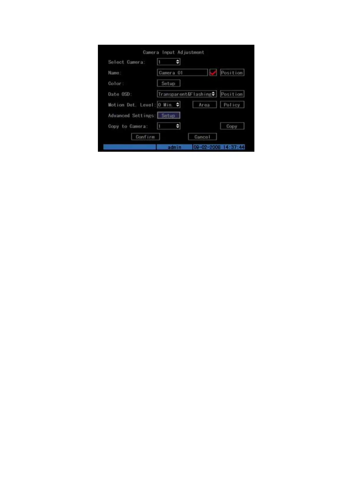 press “Policy” button to enter the sub-menu. Press [Confirm] to save
