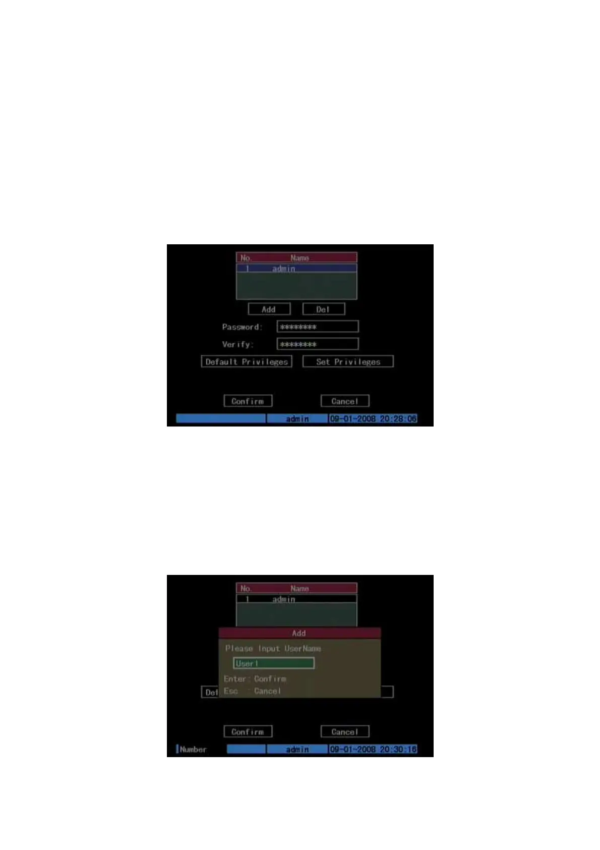 press [ENTER]and return “User Management” menu. Totally 15 users can be added.