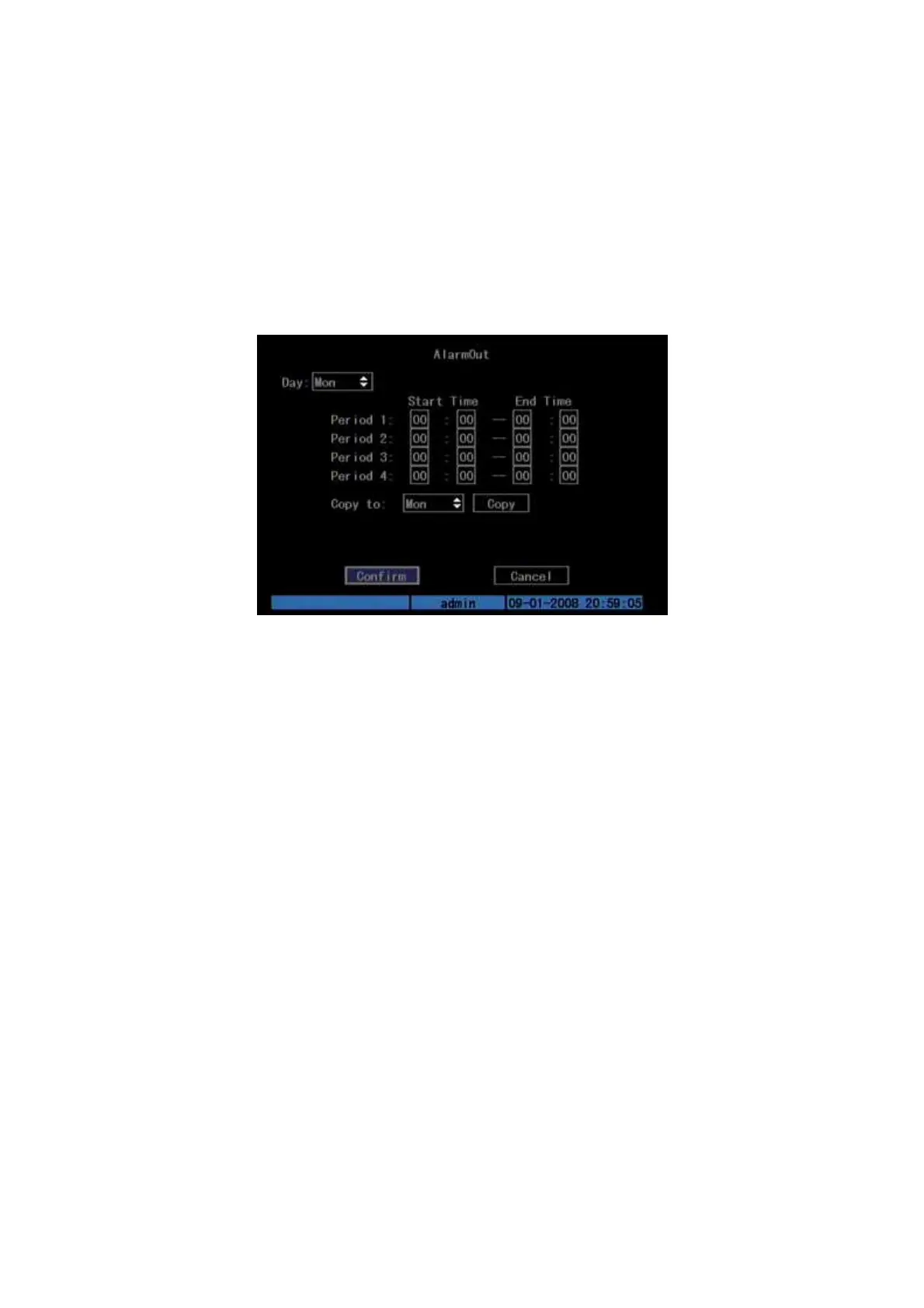 “Schedule” button on right side of “Alarm Out Time” item, press[ENTER]key to