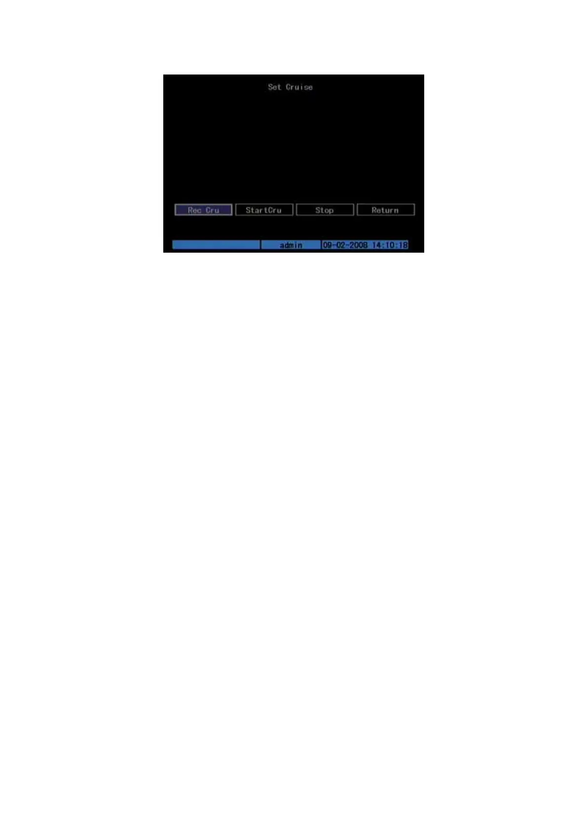 return “Cruise” setup menu. Press “StartCru” button to repeat the PTZ track until you